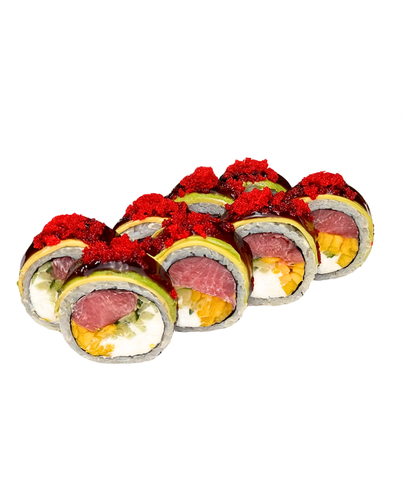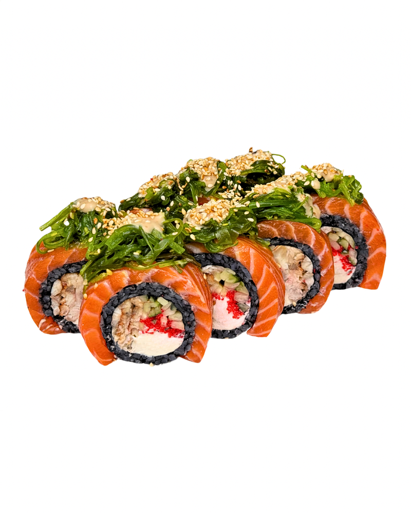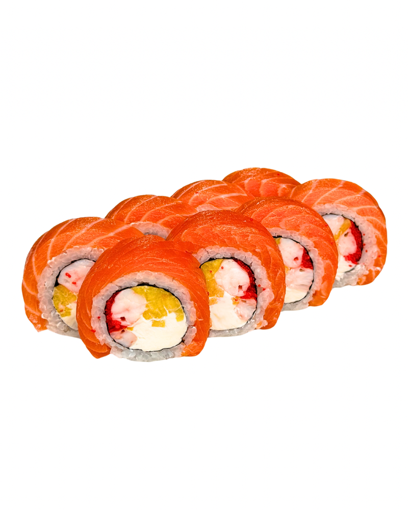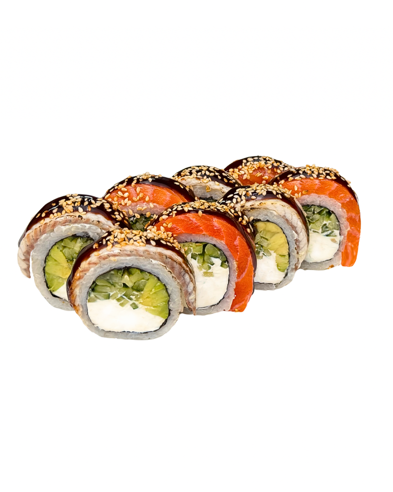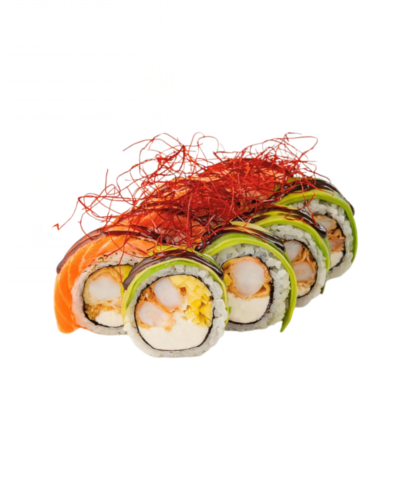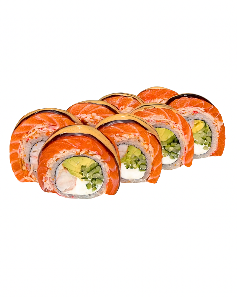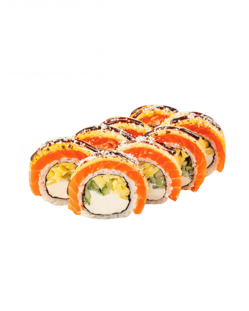 Сир чеддер, айсберг, вершковий сир, сир віола, тигрова креветка, лосось, ікра тобіко, авокадо, спайсі соус, унагі, кунжут кімчі