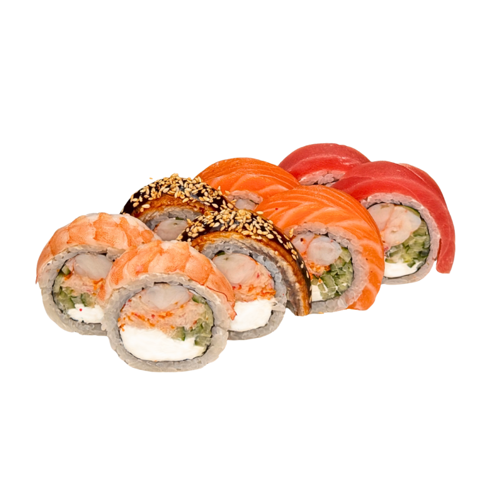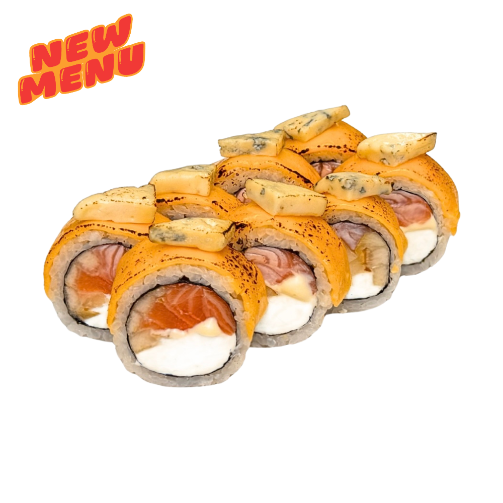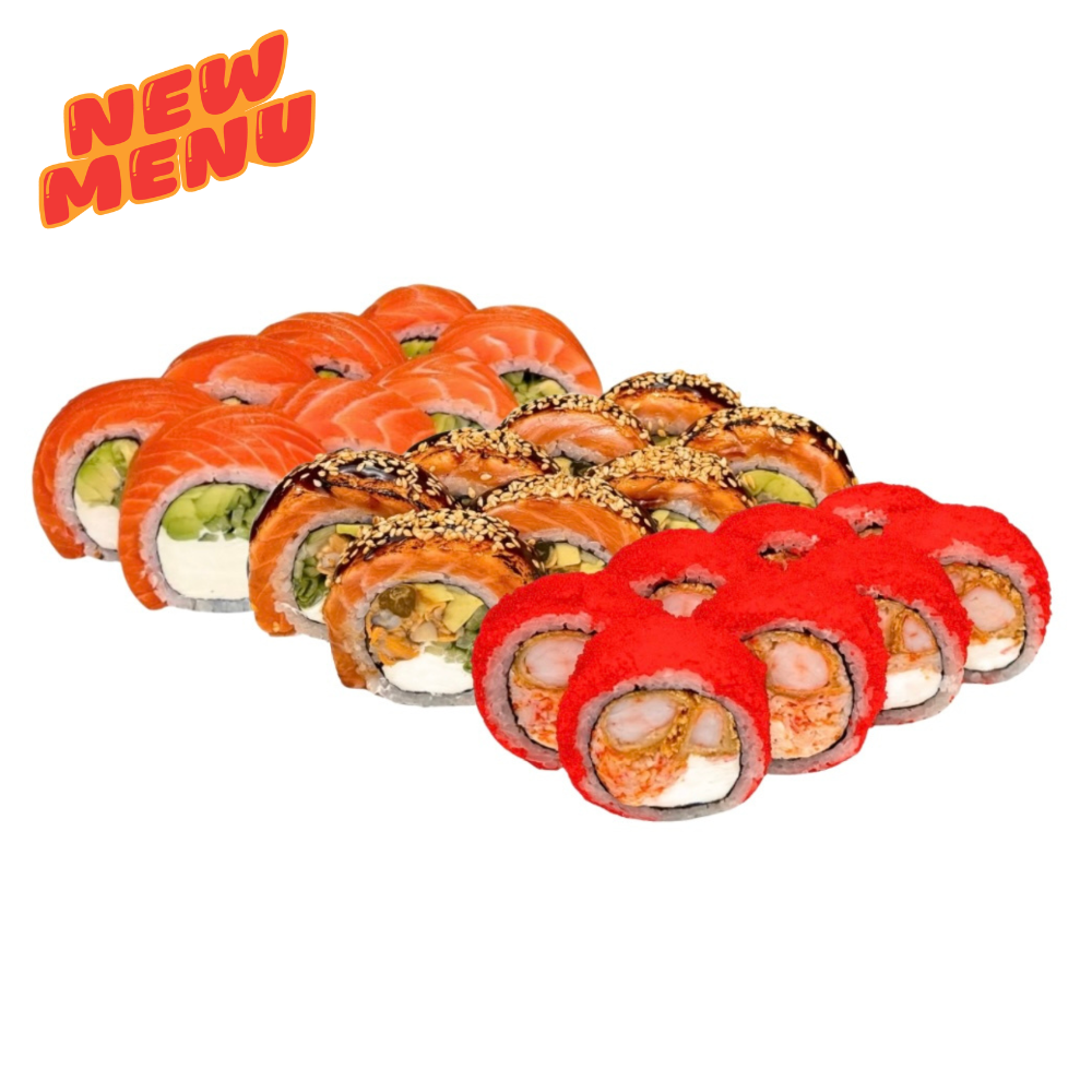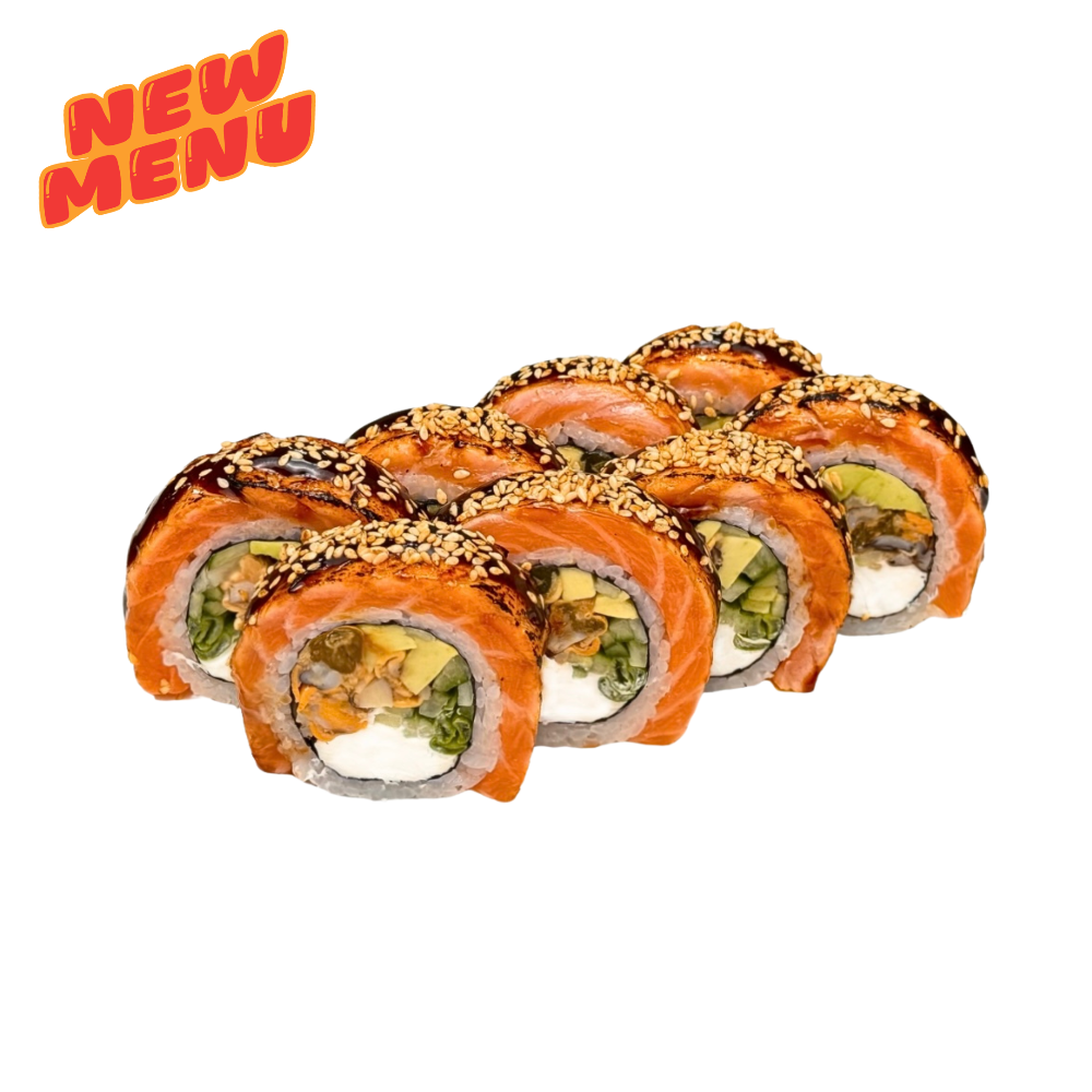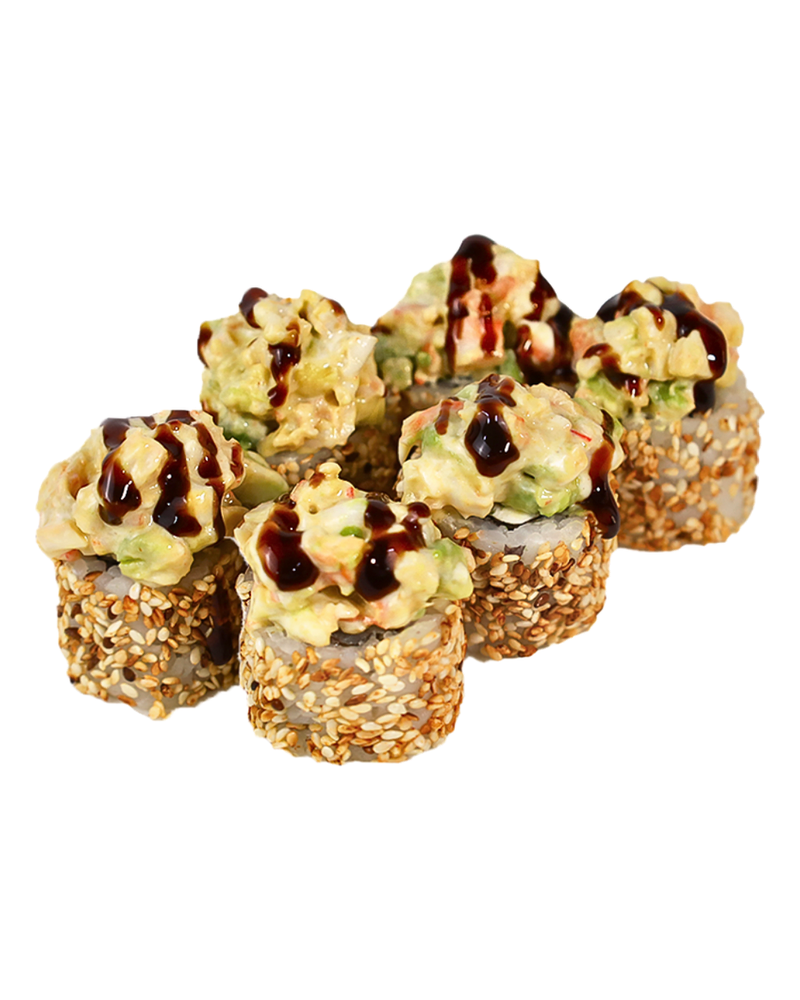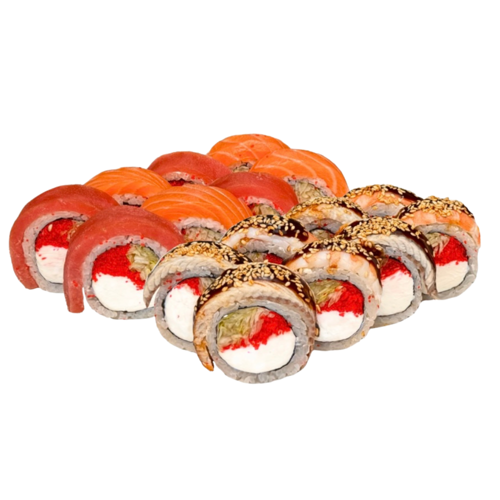 Сир чеддер, айсберг, вершковий сир, сир віола, тигрова креветка, лосось, ікра тобіко, авокадо, спайсі соус, унагі, кунжут кімчі