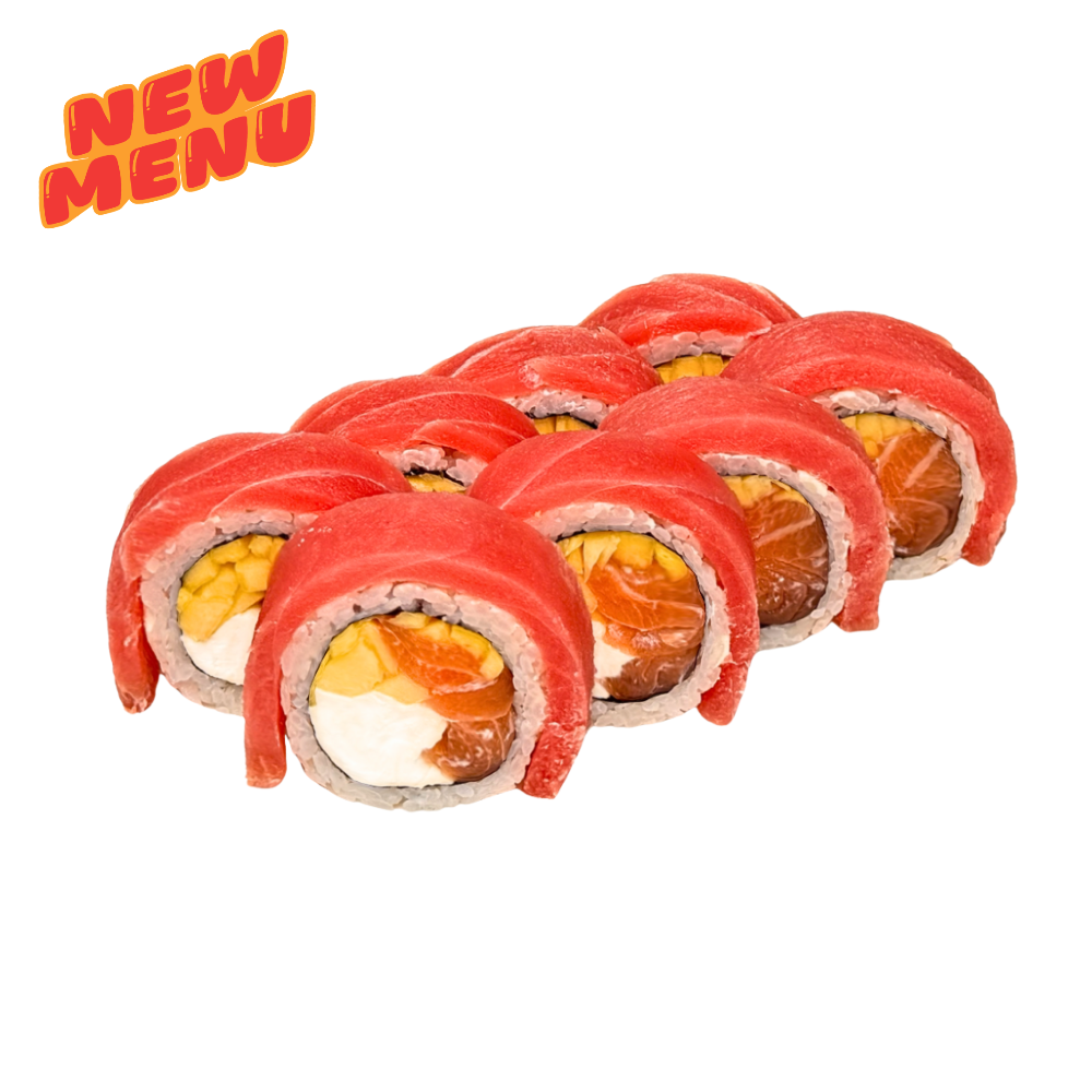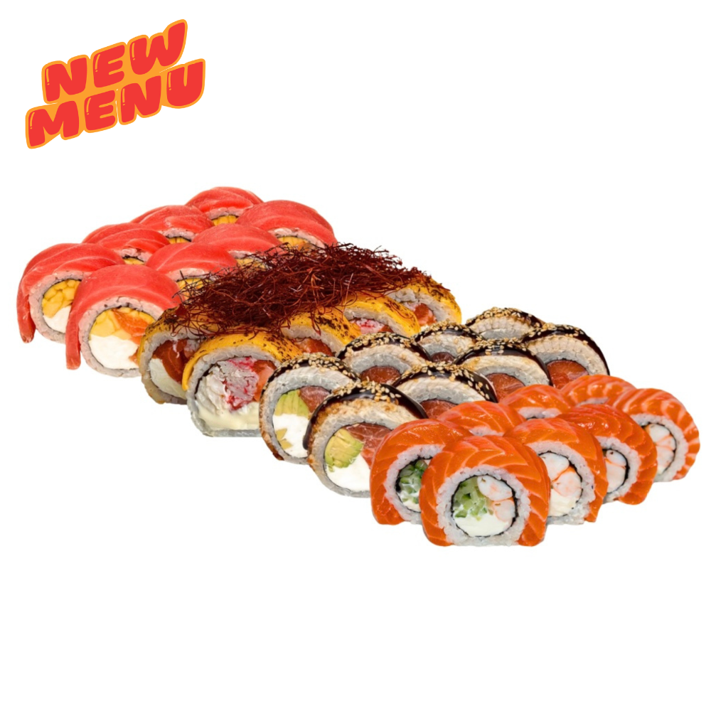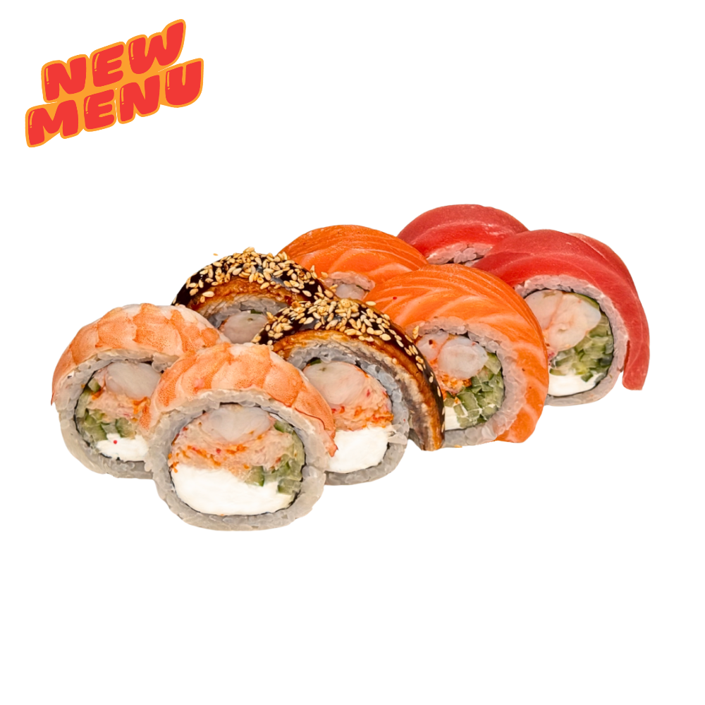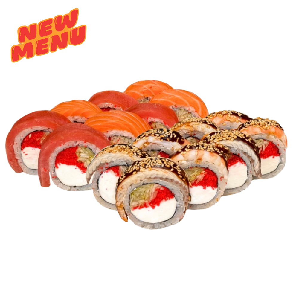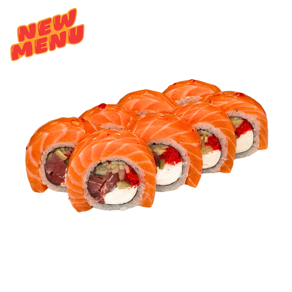 Сир чеддер, айсберг, вершковий сир, сир віола, тигрова креветка, лосось, ікра тобіко, авокадо, спайсі соус, унагі, кунжут кімчі