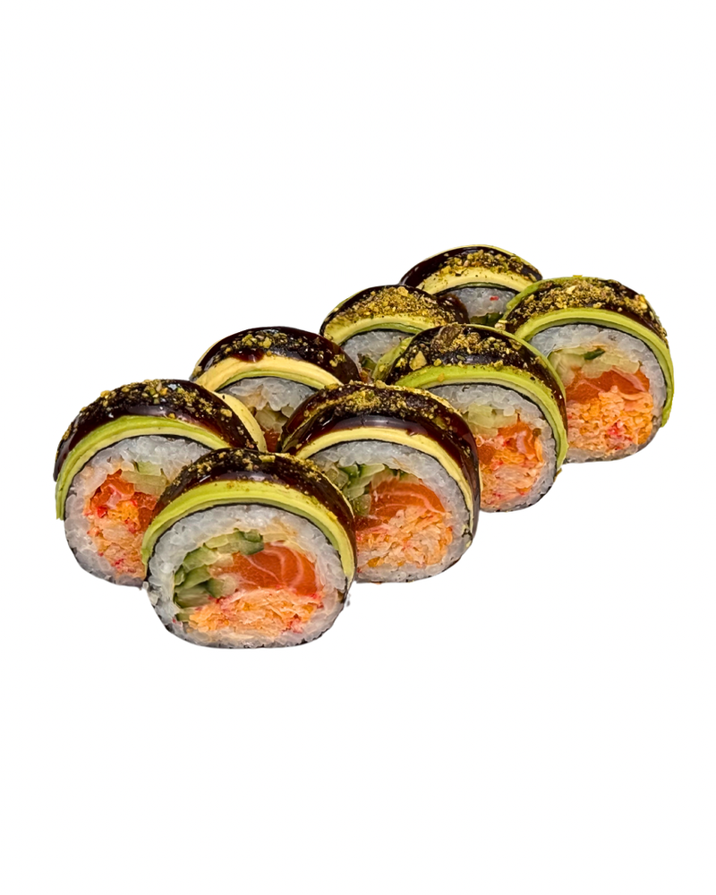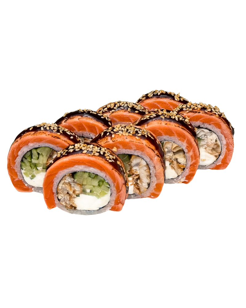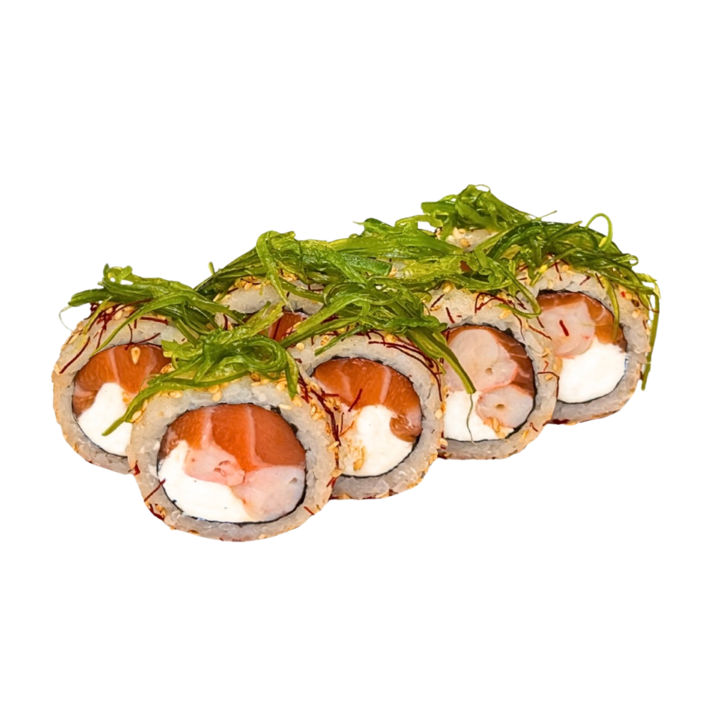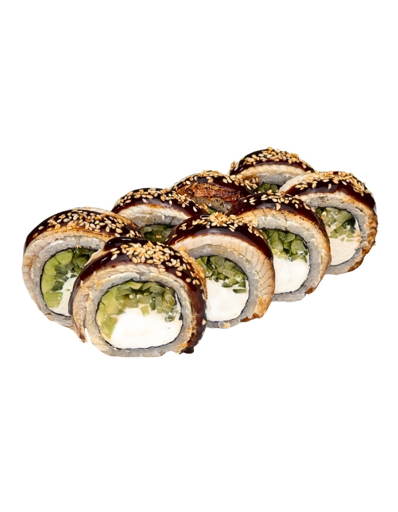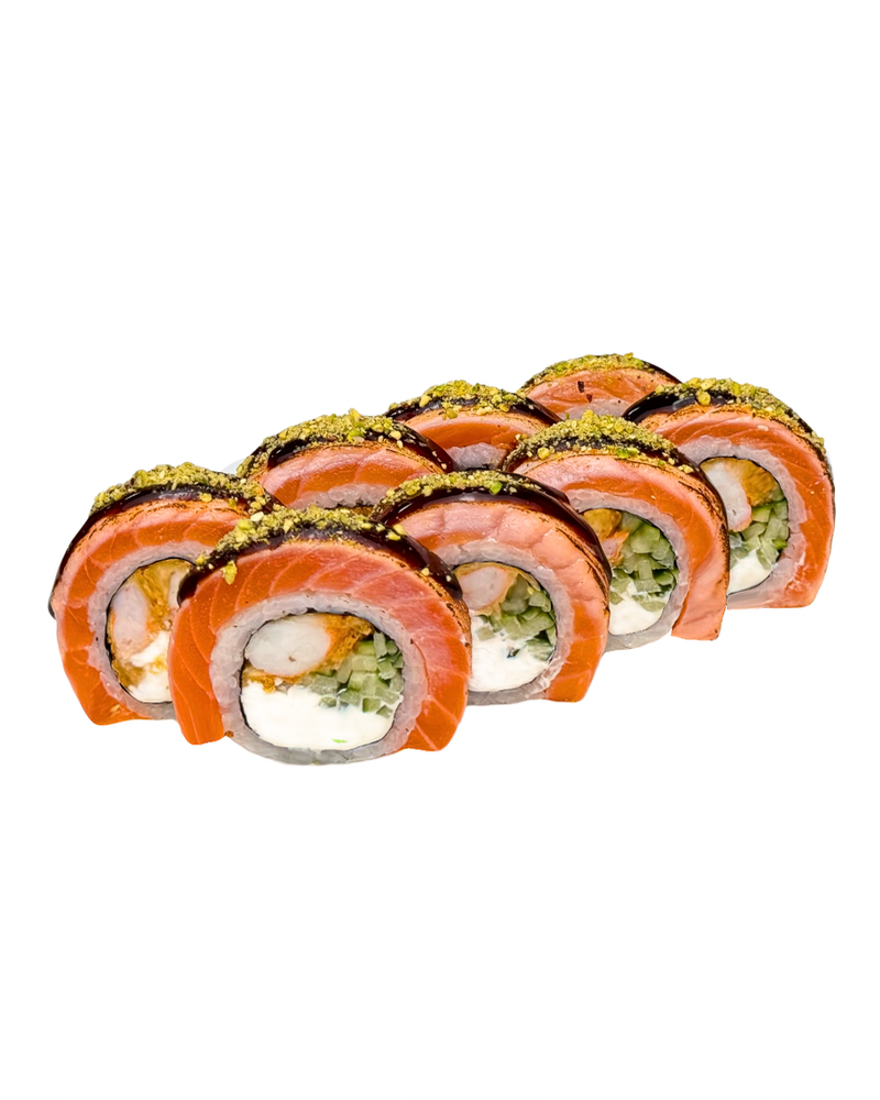 Такаші Рис, вершковий сир, огірок, креветка темпура, лосось обпалений, унагі, фісташка