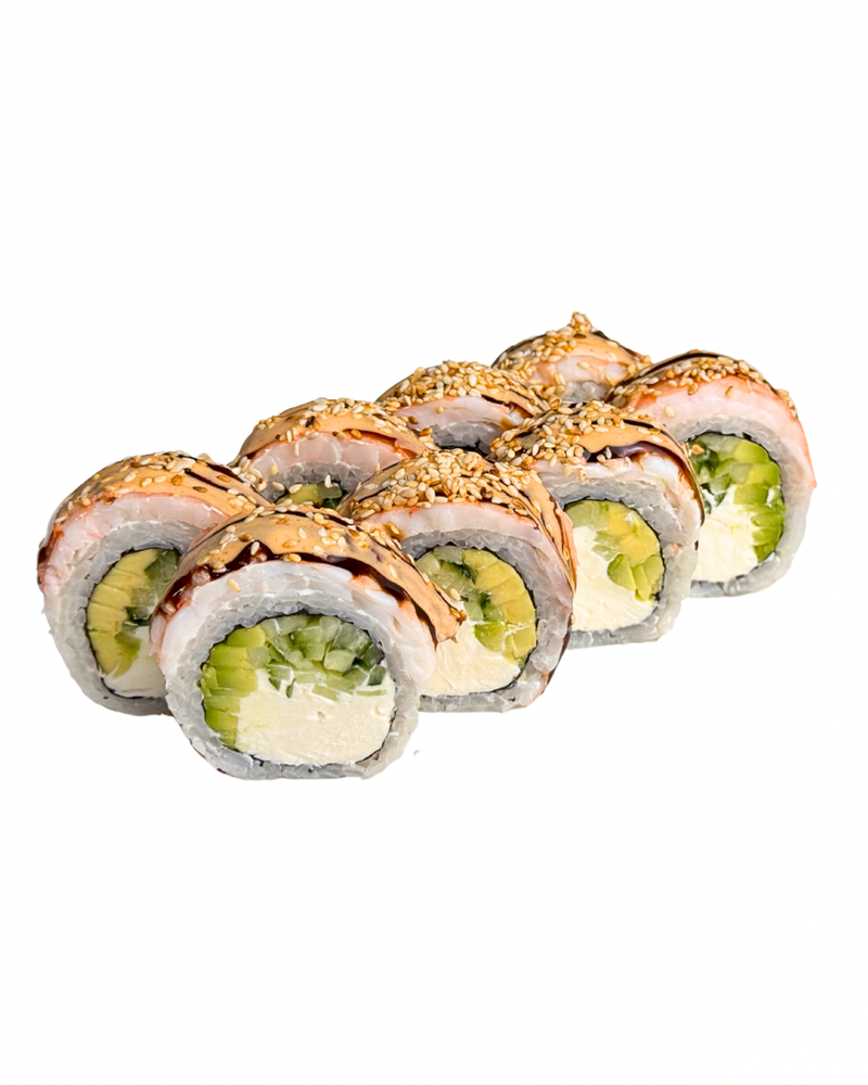 Філадельфія креветка Рис, сир, огірок, авокадо, креветка, спайсі, унагі, кунжут кімчі